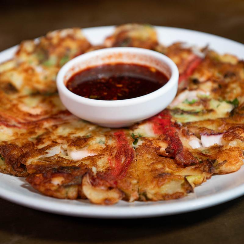 Korean-style seafood pancake - squid, crabmeat, shrimp, and vegetables.