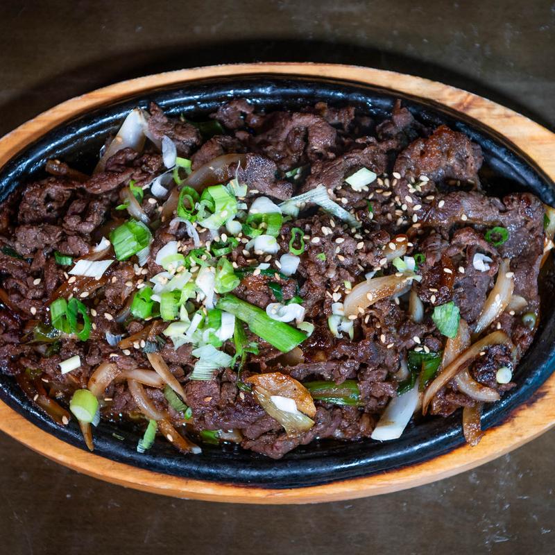 Spicy | Stone bowl with grilled spicy marinated slices of pork.