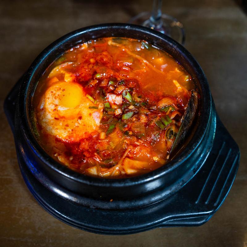 Spicy | Sizzling spicy clam soup with tofu and vegetables.